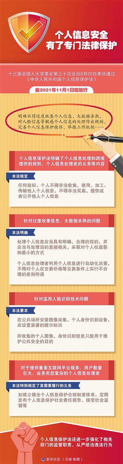 今年11月1日,《中华人民共和国个人信息保护法》(以下简称《个人信息保护法》)将正式施行。这部保护个人信息的专门法律,回应了社会上诸多热点话题。比如明确禁止大数据“杀熟”行为、加强敏感个人信息保护等,中国个人信息保护将掀开新篇章。那么,这部法律将如何保护我们的个人信息?今后个人信息能否真正由自己做主?