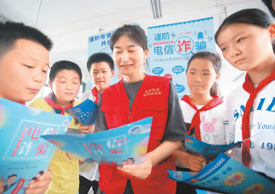 5月31日,在江苏省扬州市汤汪中心小学,社区志愿者给学生们介绍防范电信诈骗、保护个人信息的知识。孟德龙 摄(人民视觉)