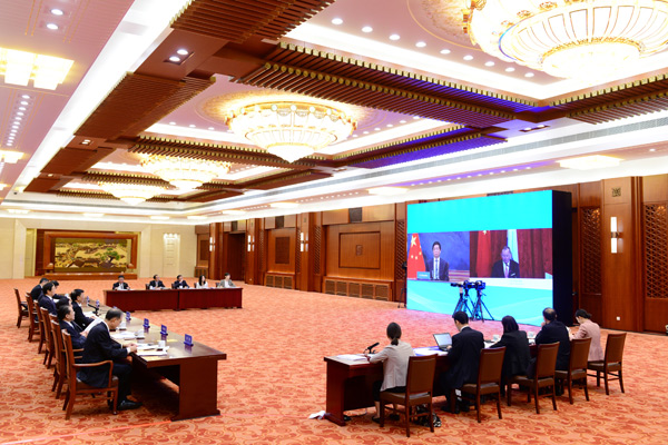 9月22日,全国人大常委会委员长栗战书在北京人民大会堂以视频方式同卢森堡国民议会议长埃特让举行会谈。马增科 摄