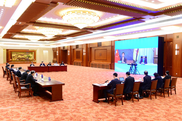 9月23日,全国人大常委会委员长栗战书在北京人民大会堂以视频方式同文莱立法会议长拉赫曼举行会谈。马增科 摄