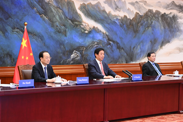 全国人大常委会委员长栗战书23日在北京人民大会堂以视频方式同文莱立法会议长拉赫曼举行会谈。