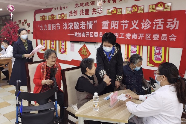 近日,天津市南开区政协与农工党南开区委会联合开展“庆重阳、送健康”义诊活动。医疗小组深入南开区养老中心,为在院老人进行义务诊疗咨询,宣传健康理念,讲解用药常识,以实际行动送上了节日祝福和温暖关爱。 钱丽 李宁馨 摄