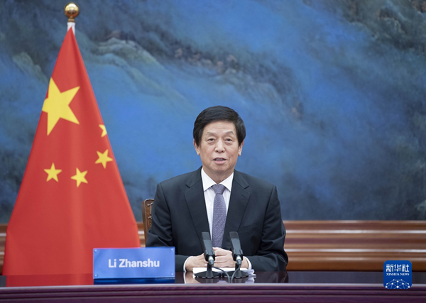 人大常委会委员长栗战书27日在北京人民大会堂以视频方式同爱尔兰众议长奥法乔尔举行会谈。