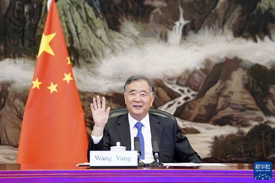全国政协主席汪洋1日在北京以视频方式会见泰国国会副主席兼上议院议长蓬佩。