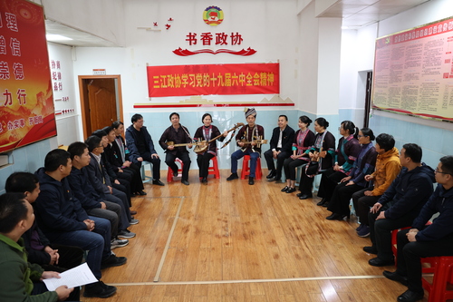 “琵琶到手歌就唱,讲个党的故事给你听,六中全会精神拿来唱……”11月19日,在广西壮族自治区柳州市三江侗族自治县政协办公室,政协机关干部和部分政协委员在富有侗族特色的琵琶歌中领悟党的十九届六中全会精神。 梁克川 摄