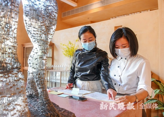 图说:王芳在和同事交流工作。新民晚报记者 陶磊 摄(下同)