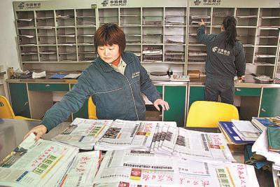 赵明翠每次投递的报刊重达几十公斤,分拣量很大。图为她正在对要投递的报刊进行分拣。