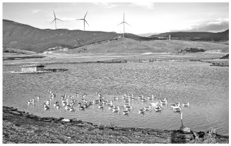 2021年12月25日,四川大凉山谷克德国家湿地公园,高山、草甸、风电塔与大雁湖里戏水的鸿雁相映成趣。 CFP供图