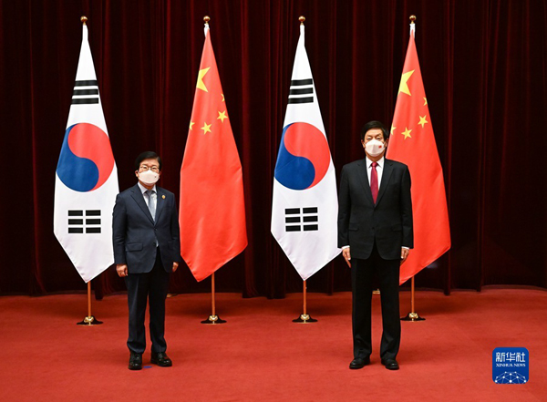 栗战书强调,立法机构交往是两国关系的重要组成部分。中国全国人大愿同韩国国会一道,延续友好传统,密切交流合作,为中韩关系发展作出新贡献。希望双方继续用好定期交流机制等平台,扩大立法机构各层级交往,分享法治建设、治国理政、经济发展等方面经验,为两国各领域合作营造良好的政策和法律环境,增强国民友好的社会基础,助力双边关系发展。