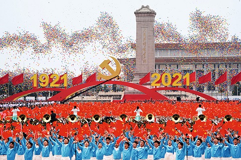 2021年7月1日上午,庆祝中国共产党成立100周年大会在北京天安门广场隆重举行。这是庆祝大会现场放飞气球。摄影/新华社记者 陈晔华