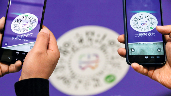 生活里的“大数据”:市民正在识别“一码游贵州”全域智慧旅游平台的二维码。通过该平台,游客到贵州旅游只需用一个二维码,就能享受“吃、住、行、游、购、娱”等相关服务。摄影/新华社记者 欧东衢