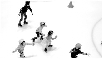 2月11日下午,几名少年在北京某溜冰场练习滑冰。