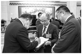 全国人大代表、中华全国律师协会副会长才华(中)向其他代表介绍自己的议案,全国人大代表、湖北得伟君尚律师事务所主任蔡学恩(左)在联名附议代表签名附页上签字。 本报记者 王建军 摄