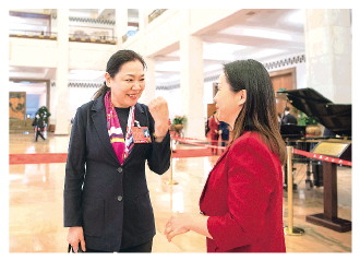 ▲ 全国人大代表、中华全国律师协会副会长李亚兰(左)与全国人大代表、广东百浩律师事务所主任黎霞交流履职感受。 本报记者 王建军 摄