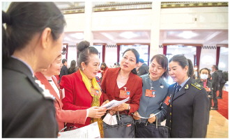 ▲ 全国人大代表、陕西省律师协会副会长方燕(右三)与女代表们就如何保障妇女儿童合法权益进行交流。 本报记者 王建军 摄