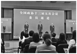 3月10日,全国政协十三届五次会议在人民大会堂举行闭幕会。会议开始前在人民大会堂新闻发布厅举行第三场“委员通道”集体采访活动。图为全国政协委员金鹏辉、武钢、林凡儒(由左至右)以网络视频方式接受媒体采访。 CFP供图