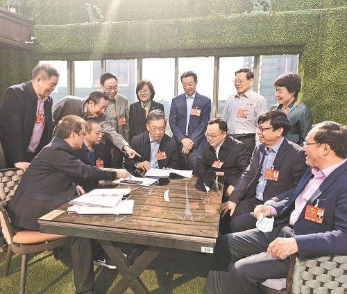 3月8日,科技界委员在小组讨论会的间歇,就“两高”报告在交流意见。 特邀委员记者 臧继辉 摄 (作者系全国政协委员、北部战区某部高级工程师 联系人:照宁)