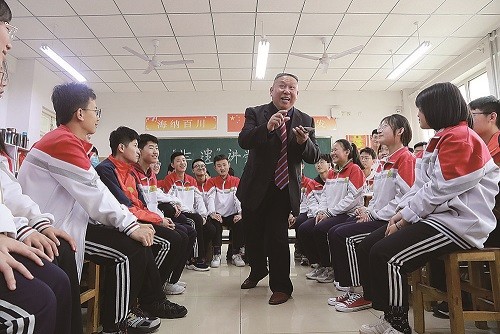 近日,山东省高密市政协开展“政协讲堂进校园”活动,组织界别委员深入全市中小学校,为学生讲解党史知识,增进爱党爱国爱家乡的深厚情怀。图为市政协委员、市曲艺团团长栗瑞杰为高密二中的学生表演快书自编曲目《百年风雨话沧桑》。 李淼 摄