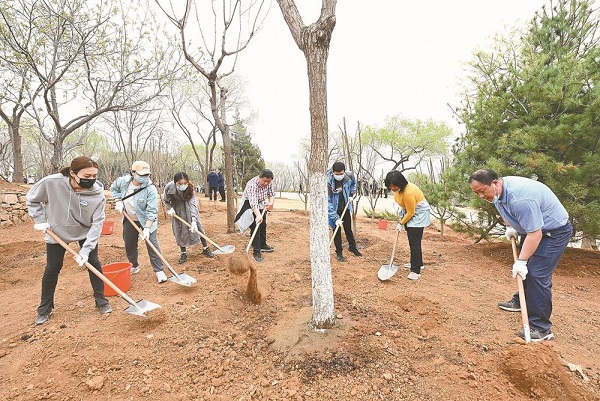 4月11日,全国政协机关在北京市海淀区西山国家森林公园开展义务植树活动。人民政协报·人民政协网记者 齐波 摄