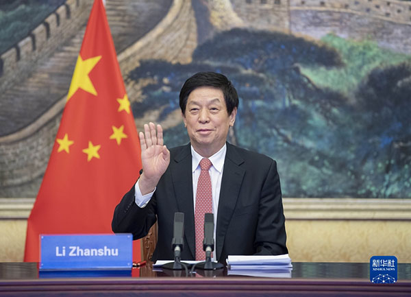4月19日,全国人大常委会委员长栗战书在北京人民大会堂以视频方式同墨西哥参议长桑切斯举行会谈。新华社记者 李涛 摄