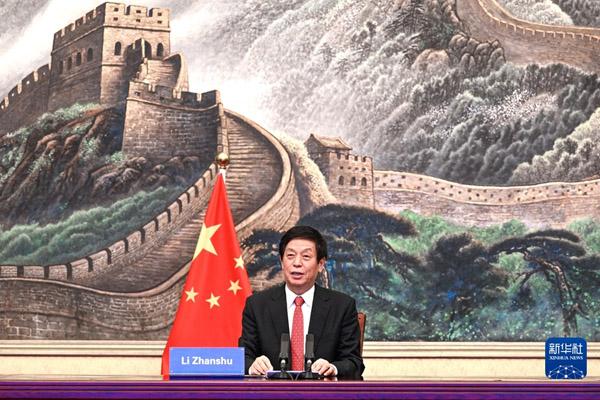 全国人大常委会委员长栗战书20日在北京人民大会堂以视频方式同马拉维议长哈拉举行会谈。