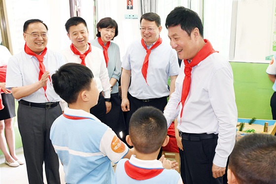 第五桥小学为城中村小学,90%的学生为外来务工人员子女,其中困难儿童25人。郭大为听取了学校基本情况介绍,观看了学生美术教学活动,向孩子们致以节日问候,鼓励他们锻炼好身体、学习好知识,做一个对社会有用、让他人喜欢的人。他指出,关爱儿童就是点亮希望,要给每一名儿童创造美好的学习生活环境,让向上向善向美的种子早早扎根心灵深处。要严格依法保护,履行法定职责,加快构建未成年人保护工作网络体系,合力做实做细各项工作,依法维护好未成年人的合法权益,用行动画好未成年人保护的“同心圆”。