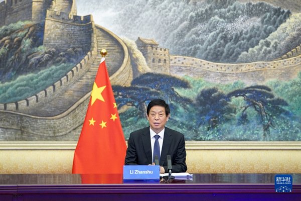 6月28日,全国人大常委会委员长栗战书在北京人民大会堂以视频方式同哈萨克斯坦议会下院议长科沙诺夫举行会谈。新华社记者 殷博古 摄
