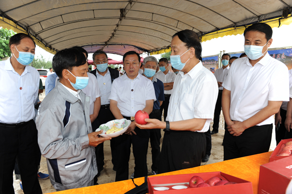 7月8日至13日,全国人大常委会副委员长、九三学社中央主席武维华率执法检查组就贯彻实施《中华人民共和国乡村振兴促进法》情况在山西省开展执法检查。图为武维华副委员长检查吉县吉昌镇桥南村果园标准化建设情况。 摄影 梁志强