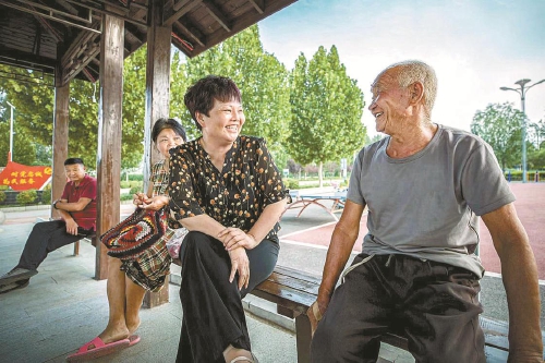 葛树芹(右二)和村民在村中心公园里拉家常。孙莹 摄