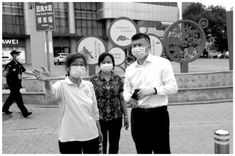 北京市朝阳区人大代表王正志(右)等根据居民点题,与朝外街道居民一起开展交通设施更新“微调研”。 薛睿杰 摄