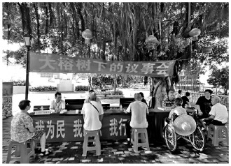 在广东省江门市人大常委会“榕树下议事会”上,市人大代表面对面听取群众意见建议。