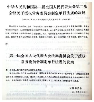 1955年7月30日,根据法案委员会的建议,一届全国人大二次会议作出决定:“随着社会主义建设和社会主义改造事业的进展,国家急需制定各项法律,以适应国家建设和国家工作的要求。在全国人民代表大会闭会期间,有些部分性质的法律,不可避免地急需常务委员会通过施行。为此,特依照中华人民共和国宪法第三十一条第十九项的规定,授权常务委员会依照宪法的精神、根据实际的需要,适时地制定部分性质的法律,即单行法规。”该决定改变了全国人大是行使国家立法权唯一机关的规定,是对1954年宪法的重要补充和发展。