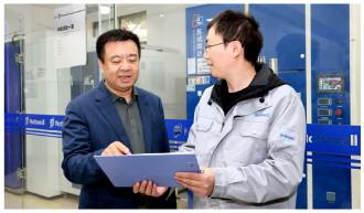 图为全国人大代表周善红(左)在江苏某电气公司调研。