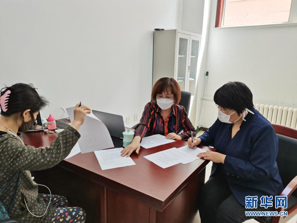 天津市和平区信访事项人民调解委员会主任王玉珍(中)对双方当事人进行调解(2020年5月13日手机拍摄)。新华社发