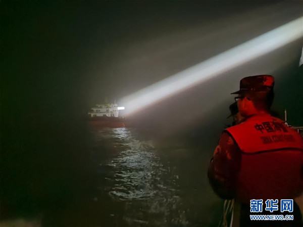 海警执法员深夜追缉涉嫌非法运砂船舶(2月28日摄)。 新华社发