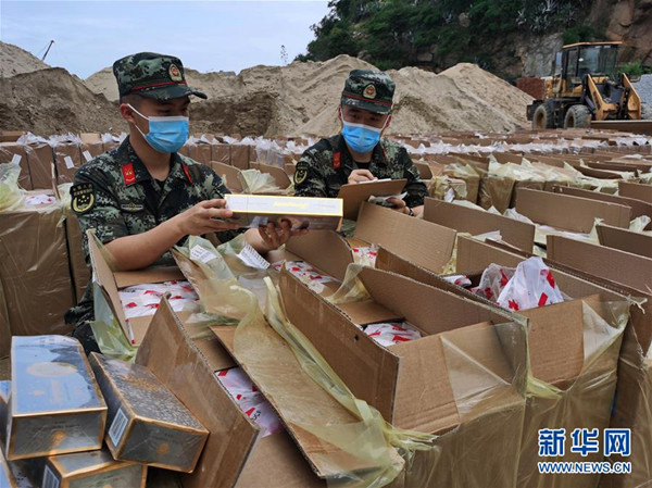 海警执法员点验涉案走私香烟(6月1日摄)。 新华社发