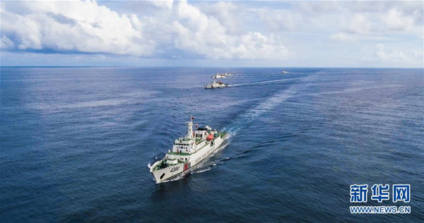 海警舰艇编队在辖区海域巡逻(7月7日摄,无人机照片)。 新华社发