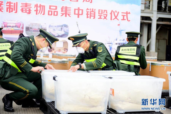 海警执法员点验涉案制毒物品(2月25日摄)。 新华社发