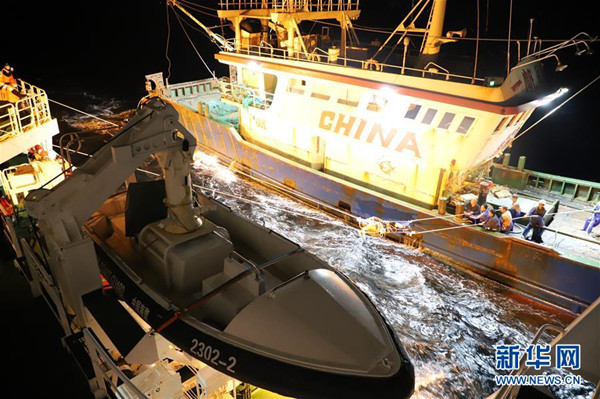 海警舰艇采用“索桥转运”方式救助伤员(3月5日摄)。 新华社发