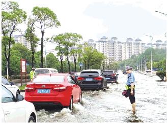 近日,江西省新余市遭受强降雨袭击,城区部分道路积水严重,不少车辆及群众被困。新余市公安局交警支队民警迅速奔赴抢险救援第一线,全力开展排险解困工作。图为民警涉水疏导指挥交通。