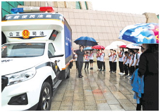 5月22日是国际生物多样性日,重庆市渝北区人民法院与重庆自然博物馆共同邀请西南师范大学实验小学学生走进重庆自然博物馆,通过“法治教育+科普展览”,让环保理念深植同学们心中。图为法院干警在车载便民法庭旁向同学们讲解长江“十年禁渔”计划。
