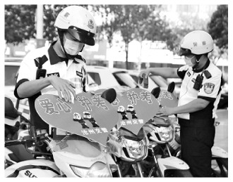 高考在即,河北省沧州市交警提前部署高考护考管控措施,为接送考生车辆“护航”。图为沧州市公安交警支队二大队铁骑交警为警用摩托车粘贴“爱心护考”标识牌。
