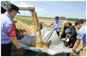 麦收时节,山东省青岛市公安局即墨分局金口派出所民警深入田间地头,开展“护农”活动,为辖区小麦颗粒归仓保驾护航。图为6月14日,金口派出所民辅警帮助村民抢收小麦。
