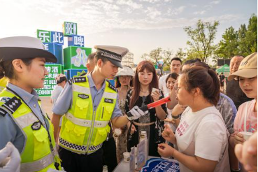 近日,陕西省西安市公安局交警支队新城大队联合西安市商务局开展“生命无价 酒后禁驾”交通安全主题宣传。图为民警通过演示酒精检测仪宣传交通安全知识。