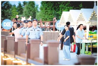 7月18日晚,2023乌巾荡啤酒龙虾节在江苏大公园(兴化)正式开幕,现场1040个座位座无虚席。为了守护夏日烟火气,护航本地夏日经济,兴化市公安局提前谋划周密部署,每日出动警力150余人次,以“定人、定岗、定责”工作原则,确保活动安全有序进行。图为执勤警力在现场巡逻。