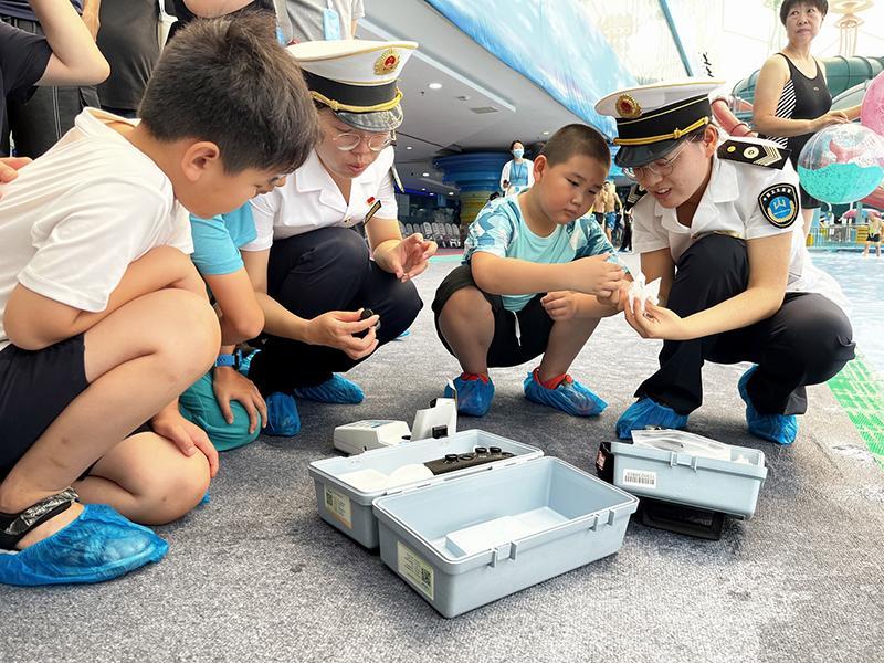 7月19日,北京市卫生健康监督所开展“关注泳池水质 体验卫监执法”开放日活动,邀请市民朋友走进水立方嬉水乐园,亲身体验游泳场所卫生监督全过程。图为卫生监督员邀请小朋友一同体验快速检测泳池水余氯情况。
