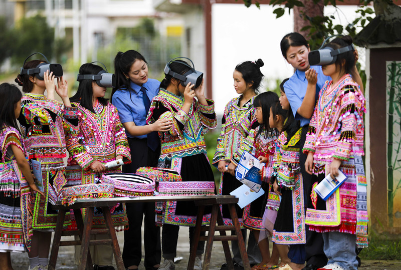 8月2日,贵州省黔西市人民检察院检察官来到协和镇杨柳社区的苗寨里,开展“法治宣传进苗寨”宣传活动。图为检察官利用VR眼镜,让村民体验吸毒对人体的危害。