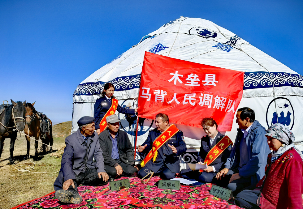 近年来,新疆维吾尔自治区木垒哈萨克自治县司法局依托各牧区基层司法所,在该县部分乡镇组建了“马背调解队”,深入牧区为牧民群众排忧解难。图为木垒县司法局雀仁司法所“马背调解队”近日在牧场开展矛盾纠纷排查化解。