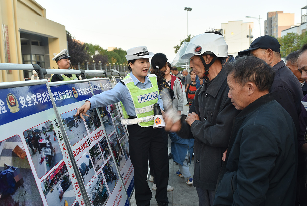 安徽省宿松县公安局交警大队近日在城区学校门口开展交通事故图片警示活动,用身边的交通事故教育身边的人,提升接送学生家长交通安全意识。图为活动现场。