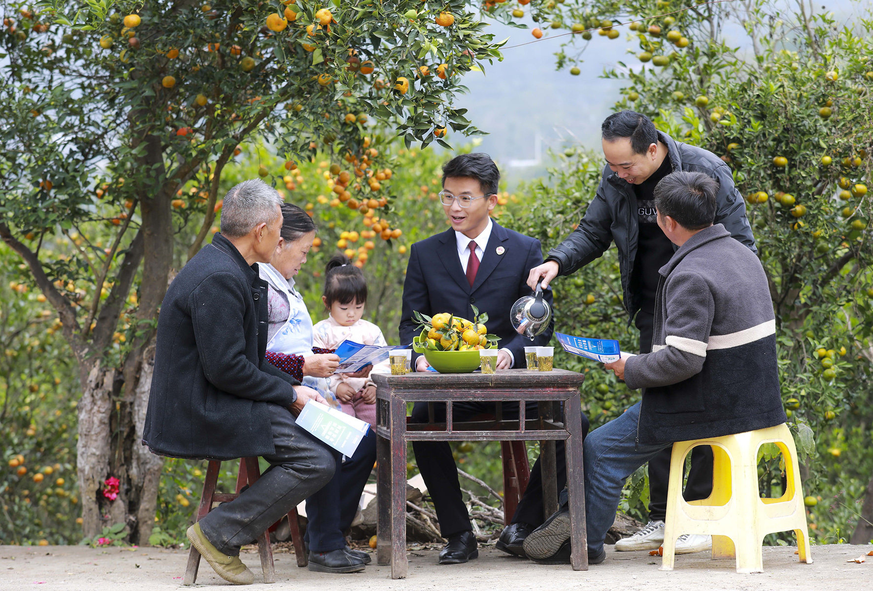 近日,贵州省黔西市人民检察院开展“送法进村助力乡村振兴”活动,检察干警走进该市素朴镇索风村农家院子和果树林,通过发放宣传册、现场解答、释法说理等方式,开展防范电诈、交通安全、环境保护等相关内容的宣传,把法律法规送到农户家门口。图为检察干警在索风村农家院子给农户讲解反诈知识。